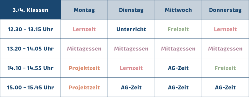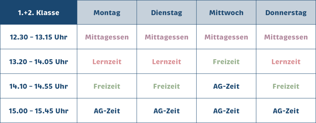 Wir sind eine verlässliche Grundschule mit garantierter Versorgung von 7.30 Uhr bis 12.30 Uhr. Für die dritten und vierten Klassen endet der Unterricht am Dienstag um 13.15 Uhr. Dem Unterricht am Vormittag schließt sich nahtlos die Ganztagsbetreuung bis 15.45 Uhr an. Ein enger Austausch zwischen allen pädagogisch Tätigen sichert die Kontinuität. Freitags gibt es von 12.30 – 15.45 Uhr eine kostenpflichtige Hortbetreuung.